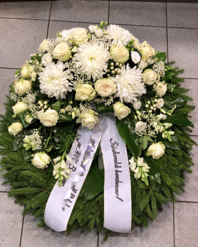 Suurema läbimõõduga pärg (u 75cm), rikkalikult kaetud valgete lilleõitega