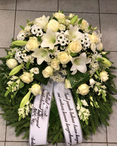 Suurema läbimõõduga pärg (u 75 cm), rikkalikult kaetud valgete lilleõitega