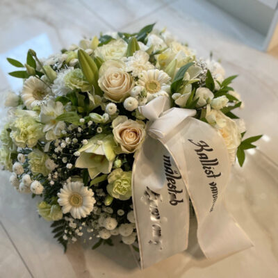 Külluslik lilleseade valgetest õitest viimasele teekonnale saatmiseks. Lilledest on valikus liiliad, roosid, minigerberad, krüsanteemid, alstromeeriad, preeriakellad. Keskmise lilleseade läbimõõt on u 50 cm, külluslik 60cm