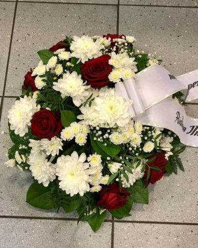 Ümar matusekimp punaste rooside ja valgete krüsanteemidega