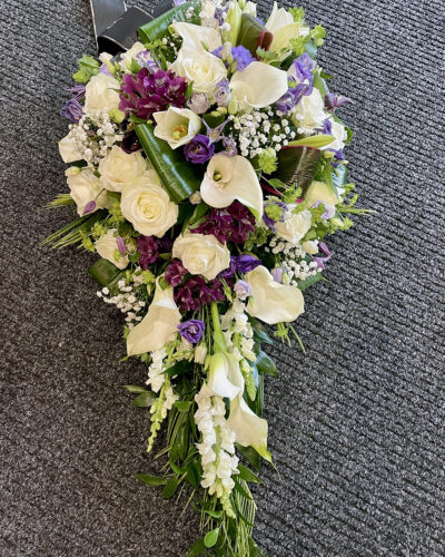 Suur ja külluslik matuseseade, mille lilledeks on kallad, liiliad, roosid, preeriakellad, lõvilõuad. Kimbu pikem külg on u 75cm