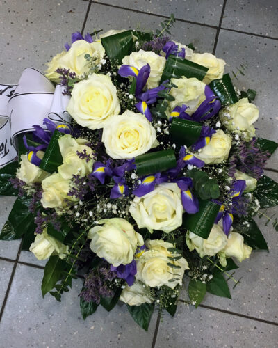 Kaunis ja soliidne lilleseade matusetalitusele. Põhililledeks valge roos ja lillakas-sinine iiris.