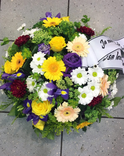 Tihedalt lilli täis ümara kujuga matusekimp. Lilledest on esindatud: minigerberad, erinevad krüsanteemid, roosid, iirised jm