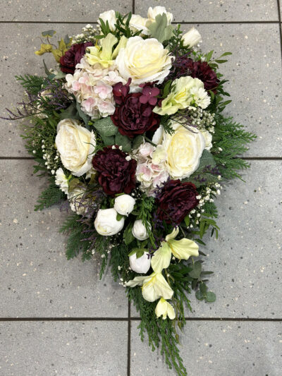 Ehtsast okaspuu põhjale tehtud kunstlilledest leinakimp valgete, kreemikate ja tumepunaste lilledega