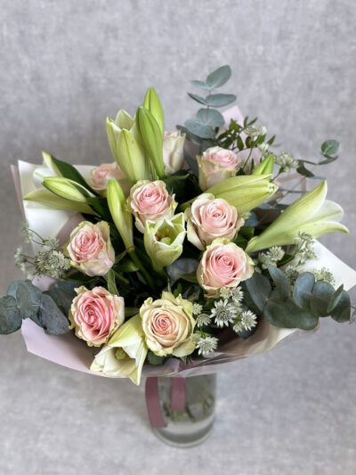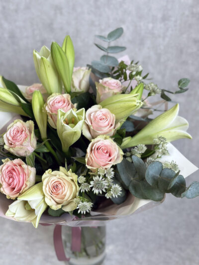 Lopsakas ja lõhnav kimp, millele annavad volüümi valged liiliad ja õrnust heleroosad roosid.